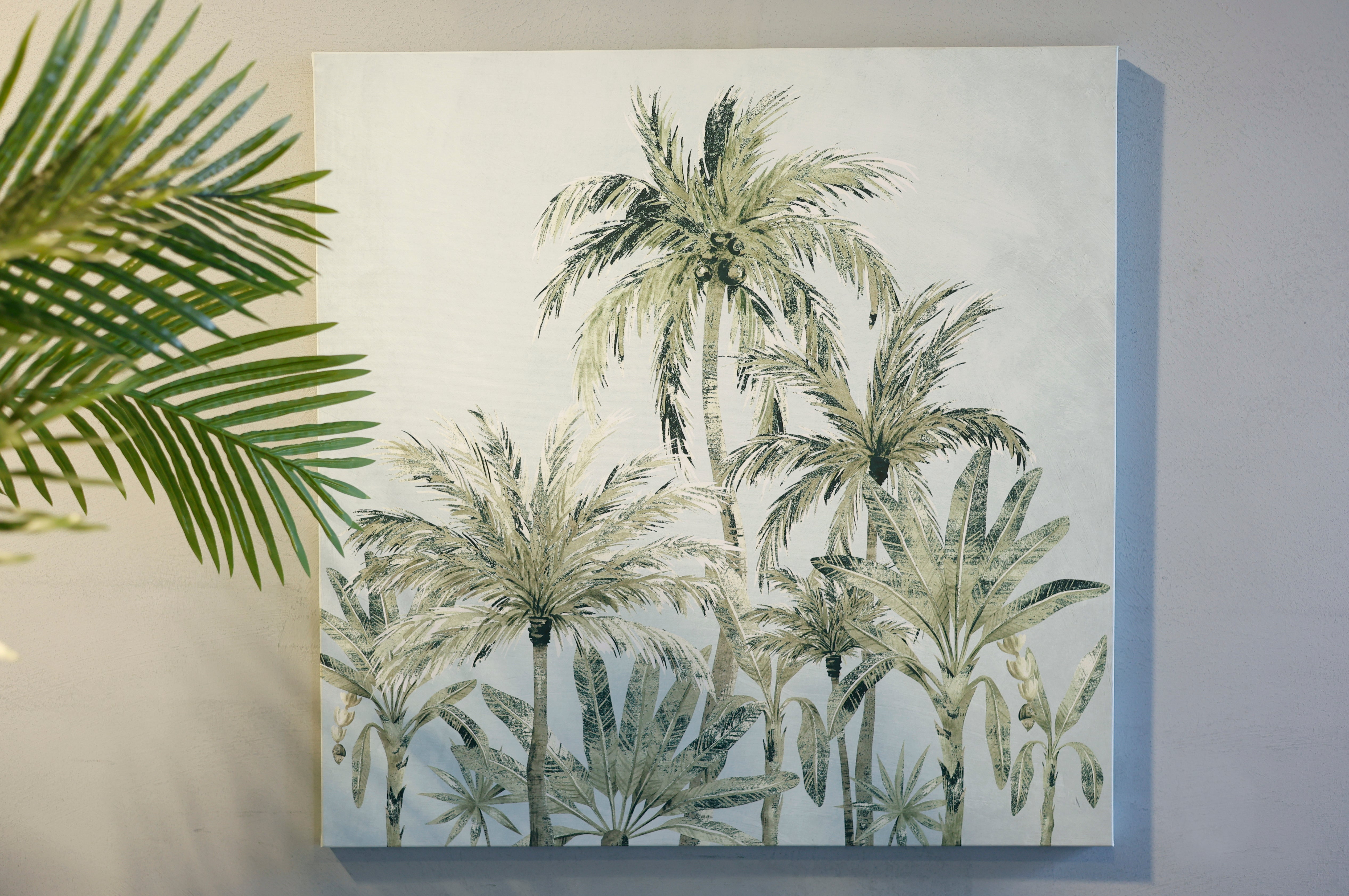 Bring the calming essence of the coast into your space with the Palm Paradise Print. Measuring 80 x 80cm, this stretched canvas artwork showcases vintage soft greens and blues, evoking a serene and tranquil atmosphere. Perfect for adding a touch of coastal charm to any room.
