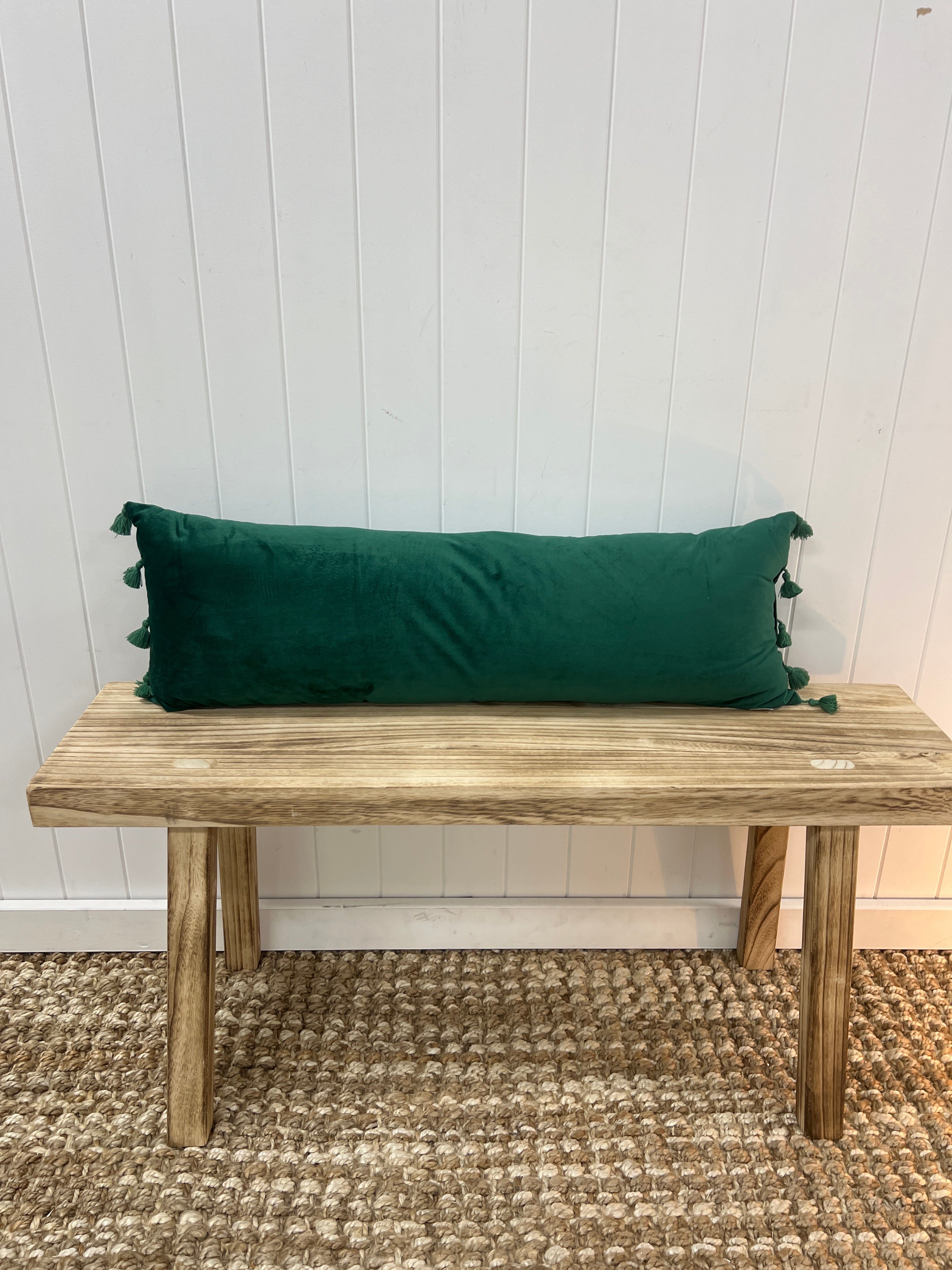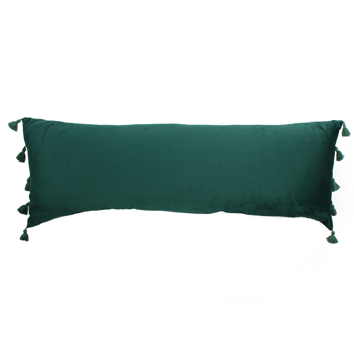 Introducing the luxurious long green velvet cushion. Immerse yourself in elegance with its emerald green velvet fabric, adding a touch of opulence to any space. Measuring 90 x 30cm, this long cushion is adorned with delicate tassels, creating a truly lavish look. Elevate your home decor with this velvet cushion today.