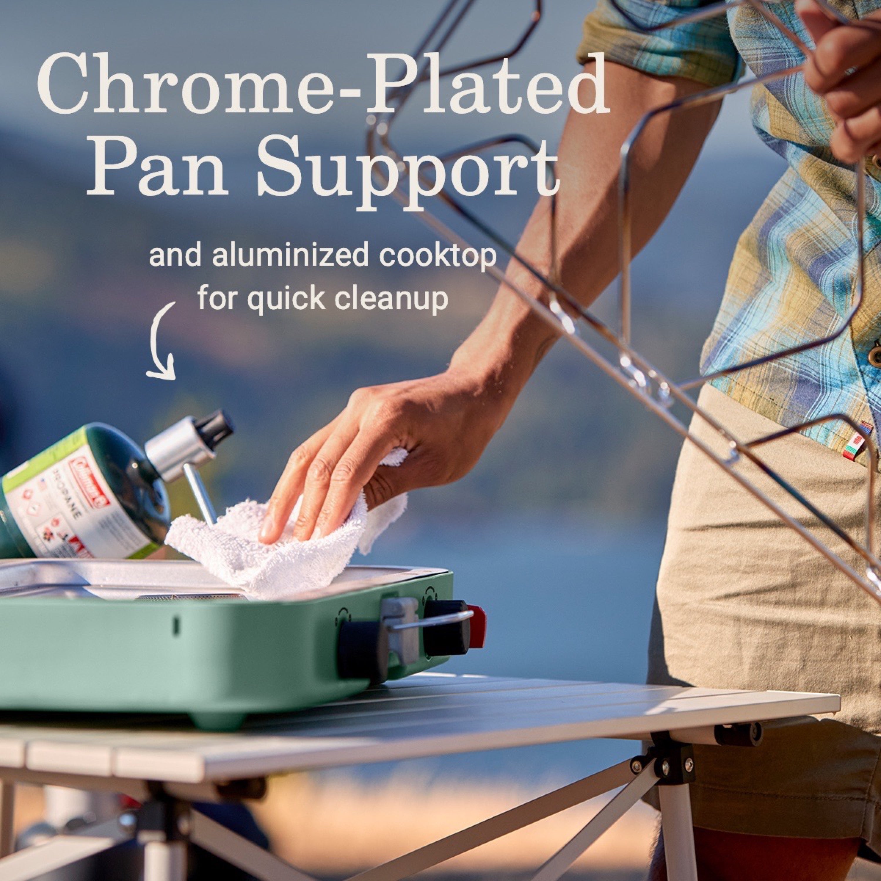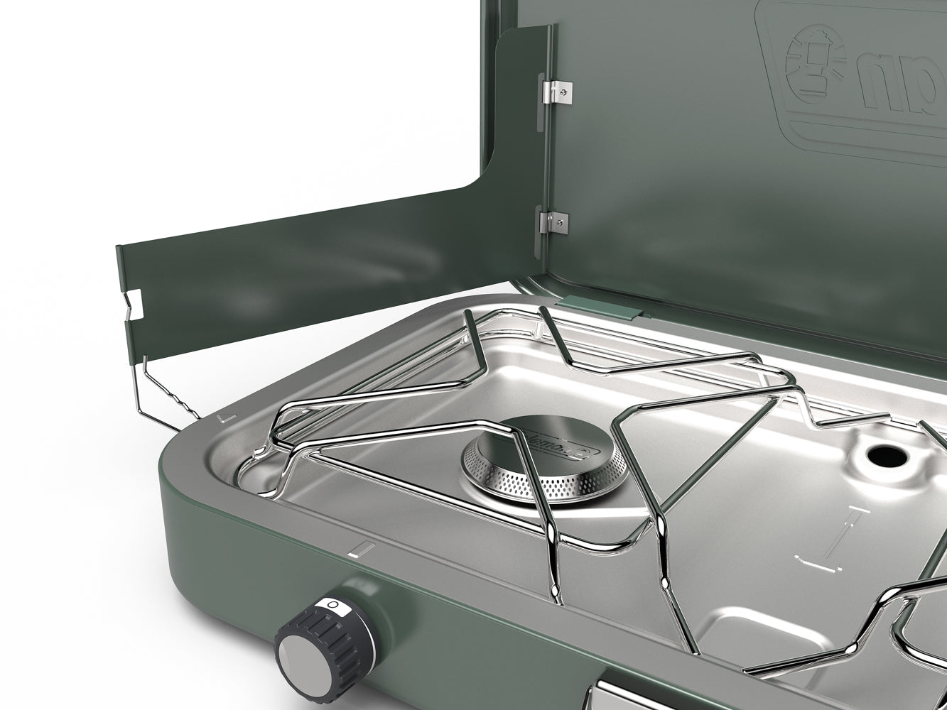 Level up your food game with the Cascade™ Collection. Perfect for those times when trail mix just won't cut it, the Cascade 222 2-Burner Camping Stove makes it easy to cook great meals outdoors. Its recessed carry handle makes it portable so you can bring along to the campsite. Ready to head home? Its aluminized steel cooktop and removable chrome-plated pan support makes cleanup quick.