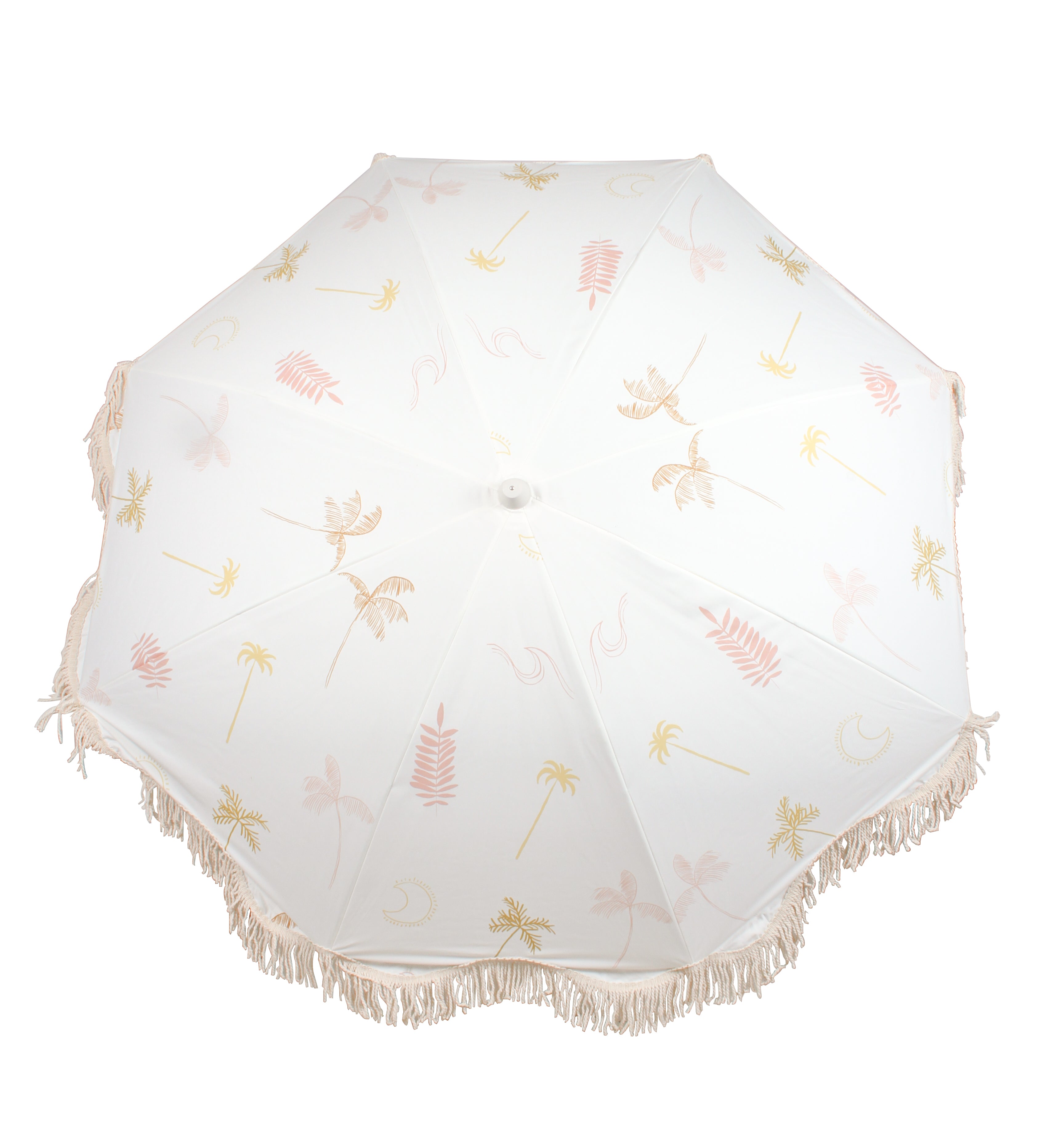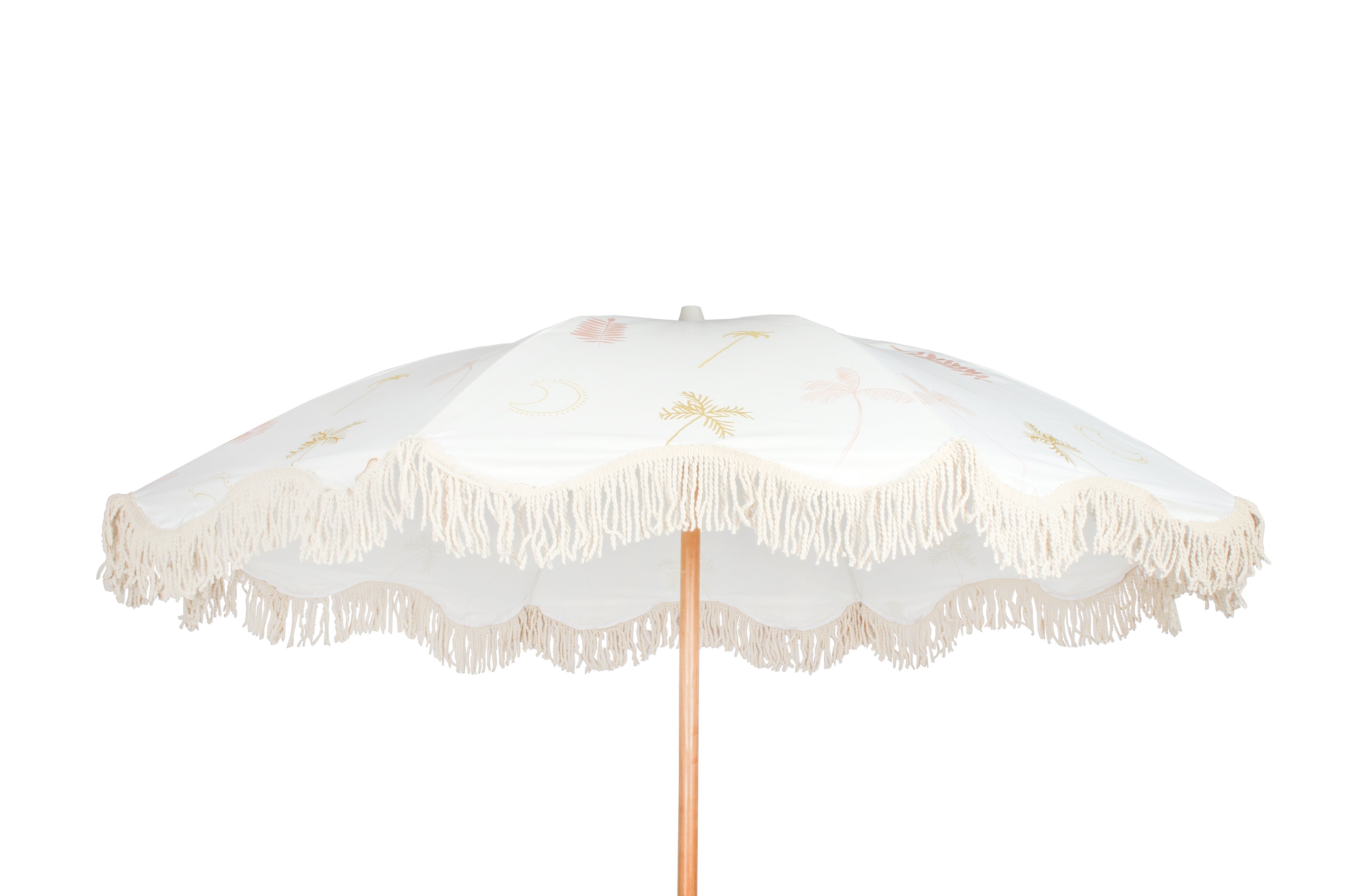 Introducing the luxury Coco & Waves Beach Umbrella - your ultimate companion for sunny days by the shore. Made with durable canvas, cotton and a sturdy wooden pole, this