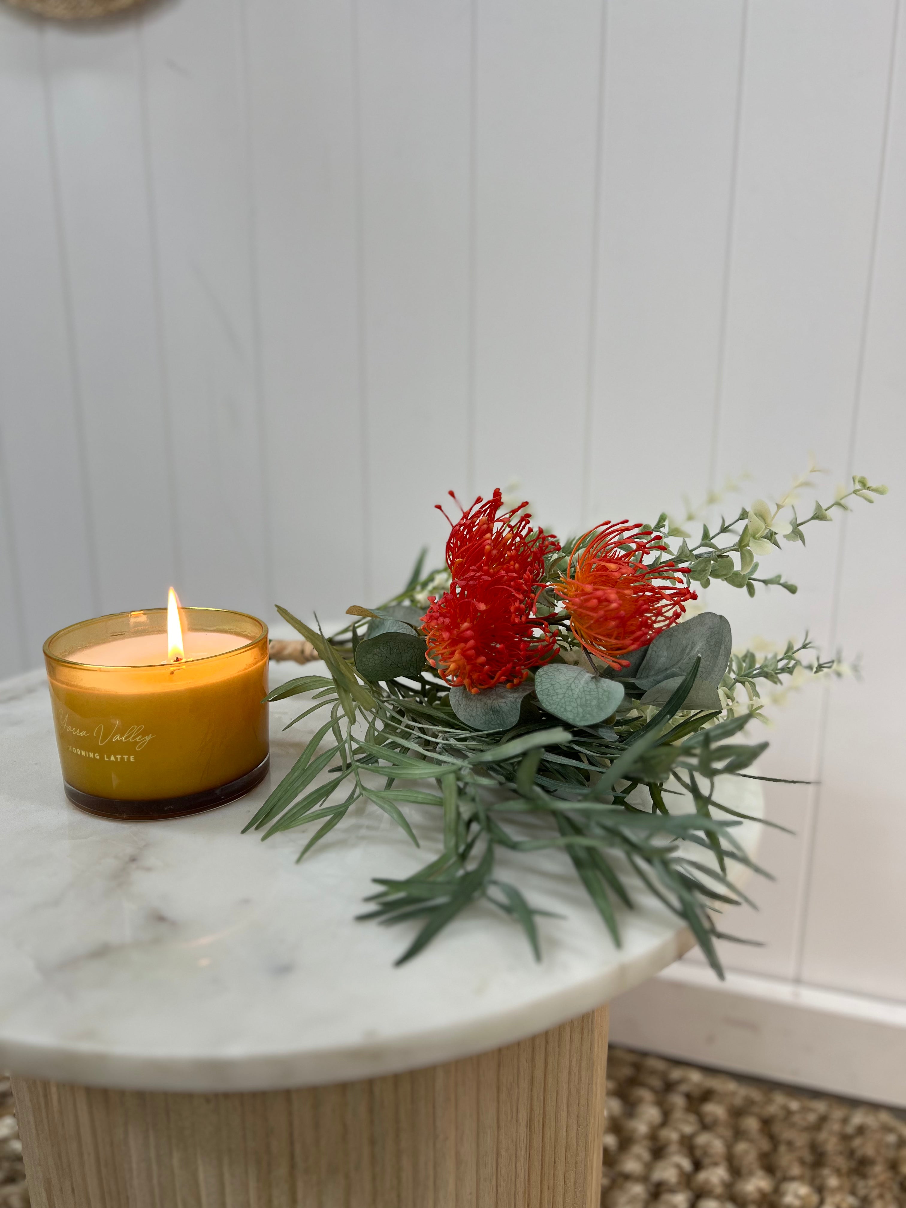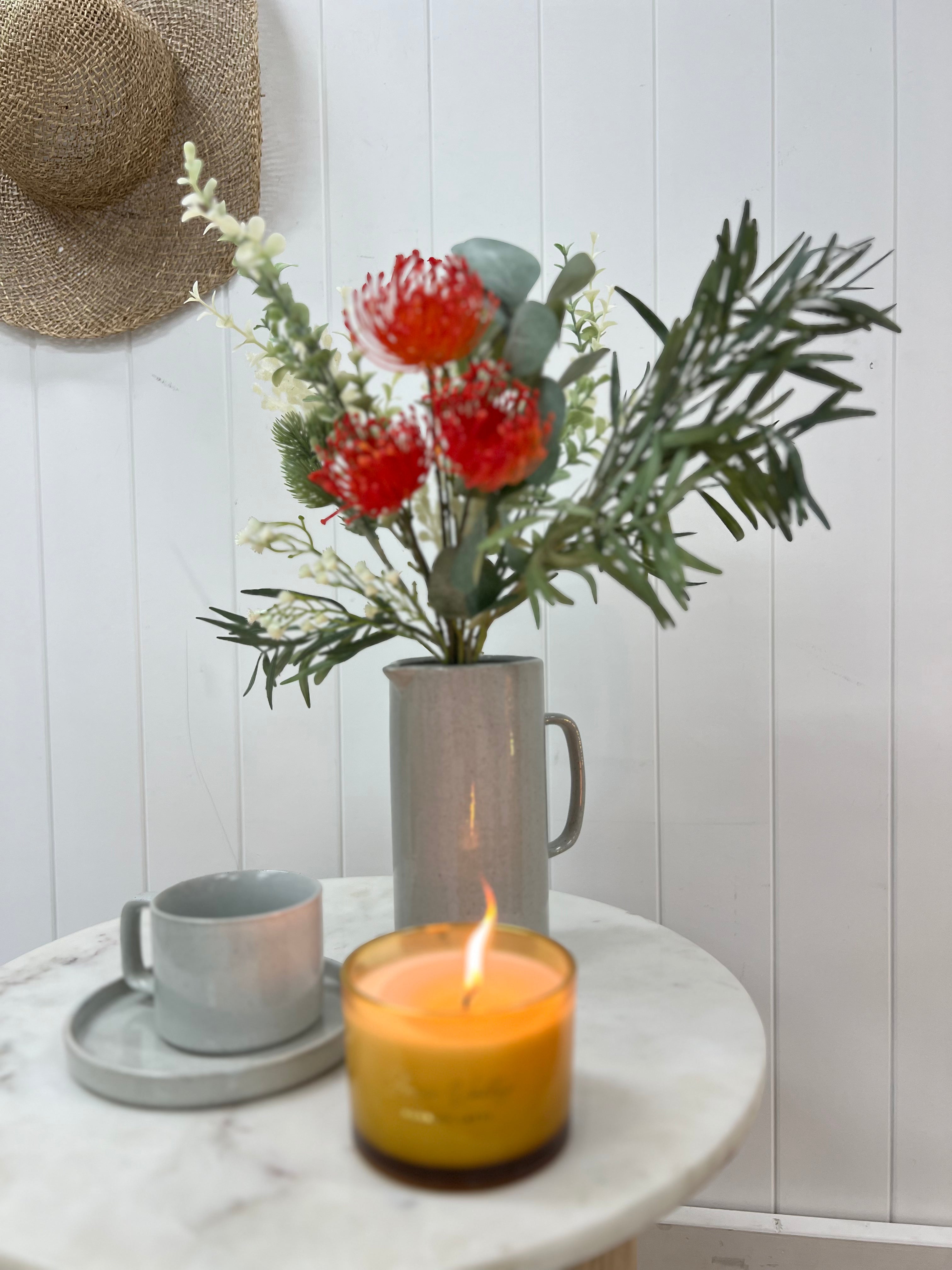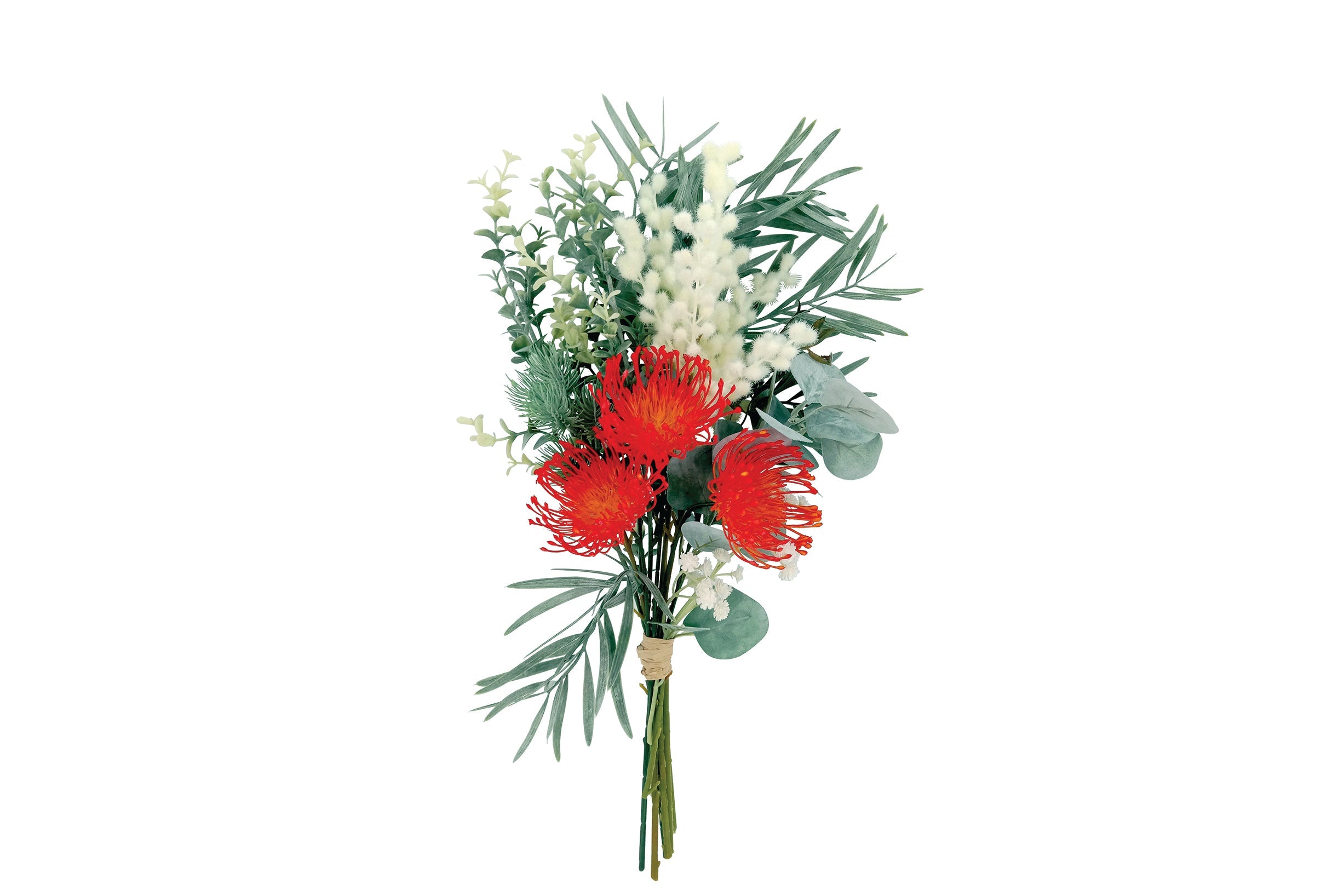 Bring the beauty of nature indoors with the Pincushion & Eucalyptus Bouquet. Expertly crafted, each bloom and stem is designed to mimic the appearance of real flowers and foliage, creating a lifelike arrangement that will never wilt. The vibrant colours of the blooms paired with the refreshing greenery of the leaves add a touch of elegance to any setting. Â What are you waiting for.... Get yours today!