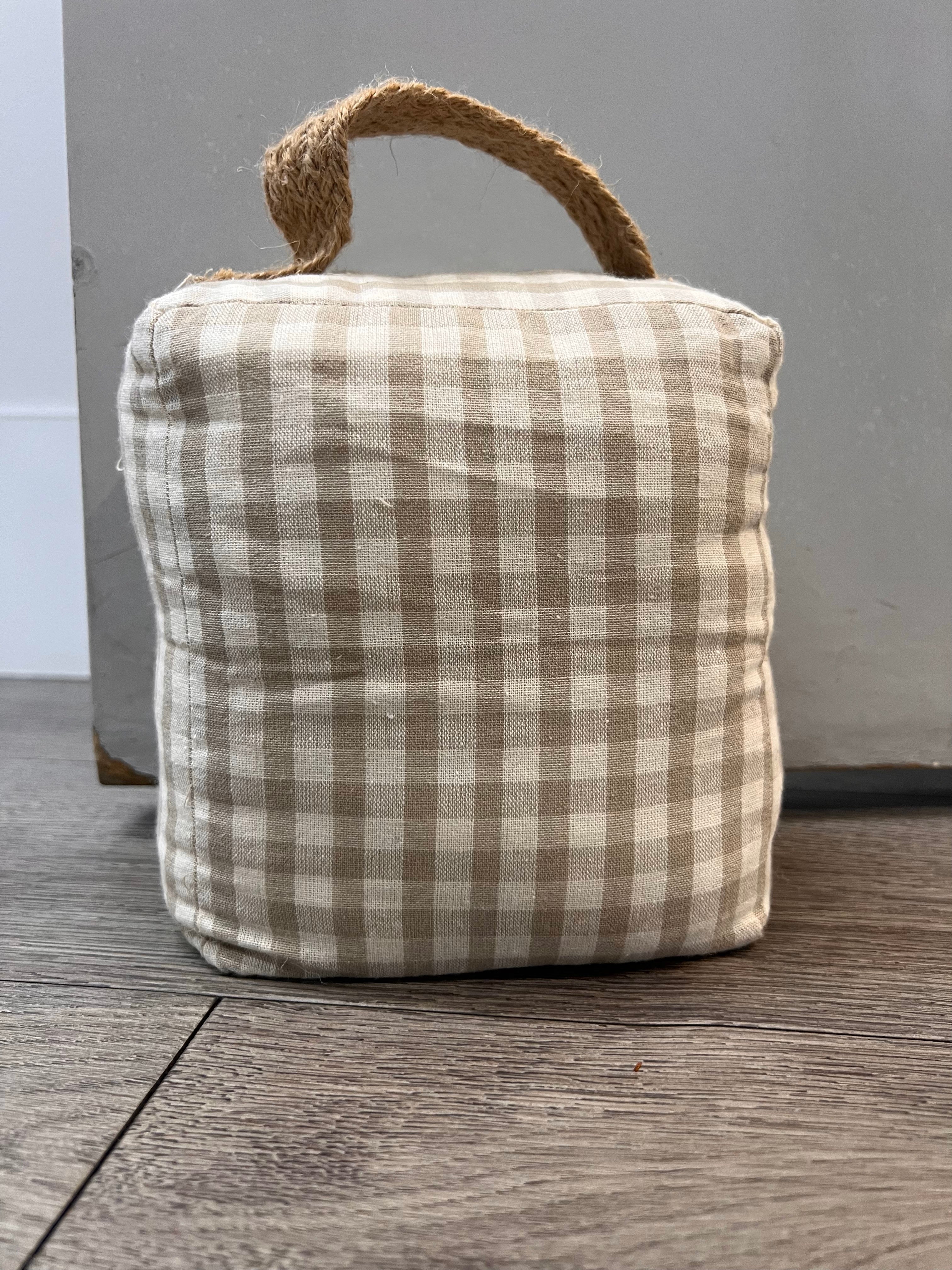 Imagine never having to worry about doors slamming shut during naptime or struggling to keep the fresh air flowing on a breezy day. Our door stop is your silent guardian, ensuring peace of mind and comfort for your entire family. Crafted from a durable combination of polyester, cotton and sand, this door stop is built to withstand the hustle and bustle of family life. Its neutral white and beige tones and gingham print effortlessly complement any décor, adding a touch of understated elegance to your living spaces.
