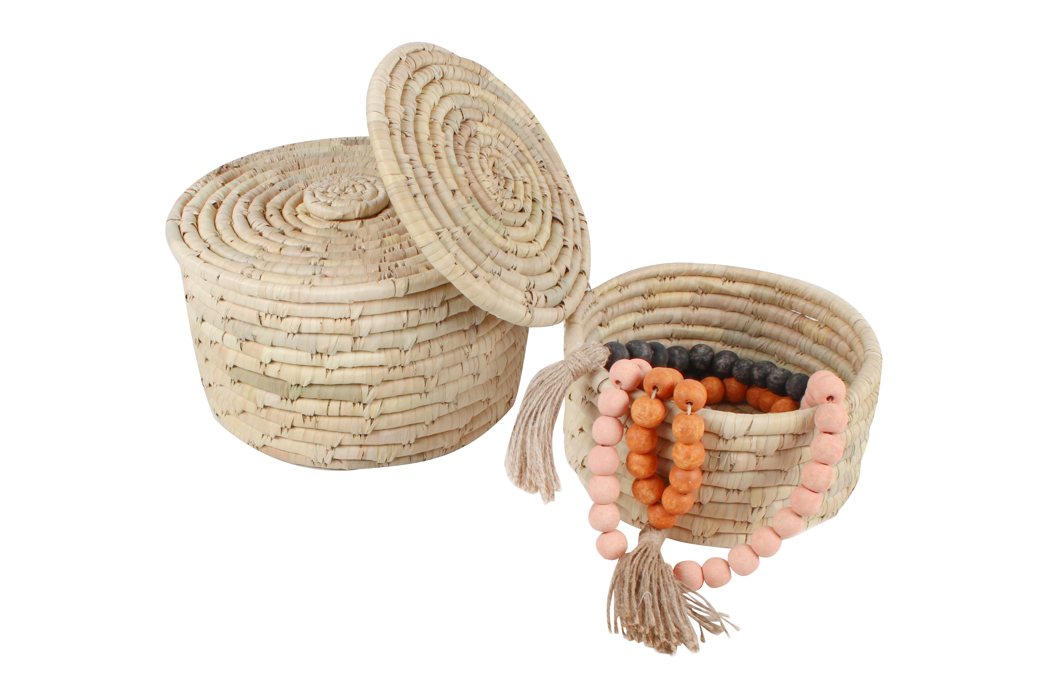 Crafted from natural Seagrass and date leaf, these small baskets with lid are not only functional but also aesthetically pleasing. The intricate weaving adds a touch of texture and sophistication to any room. Perfect for storing small items like keys, remote controls, or even as a stylish planter for your favorite succulent. Bring a touch of nature into your home with these versatile and beautifully designed baskets.