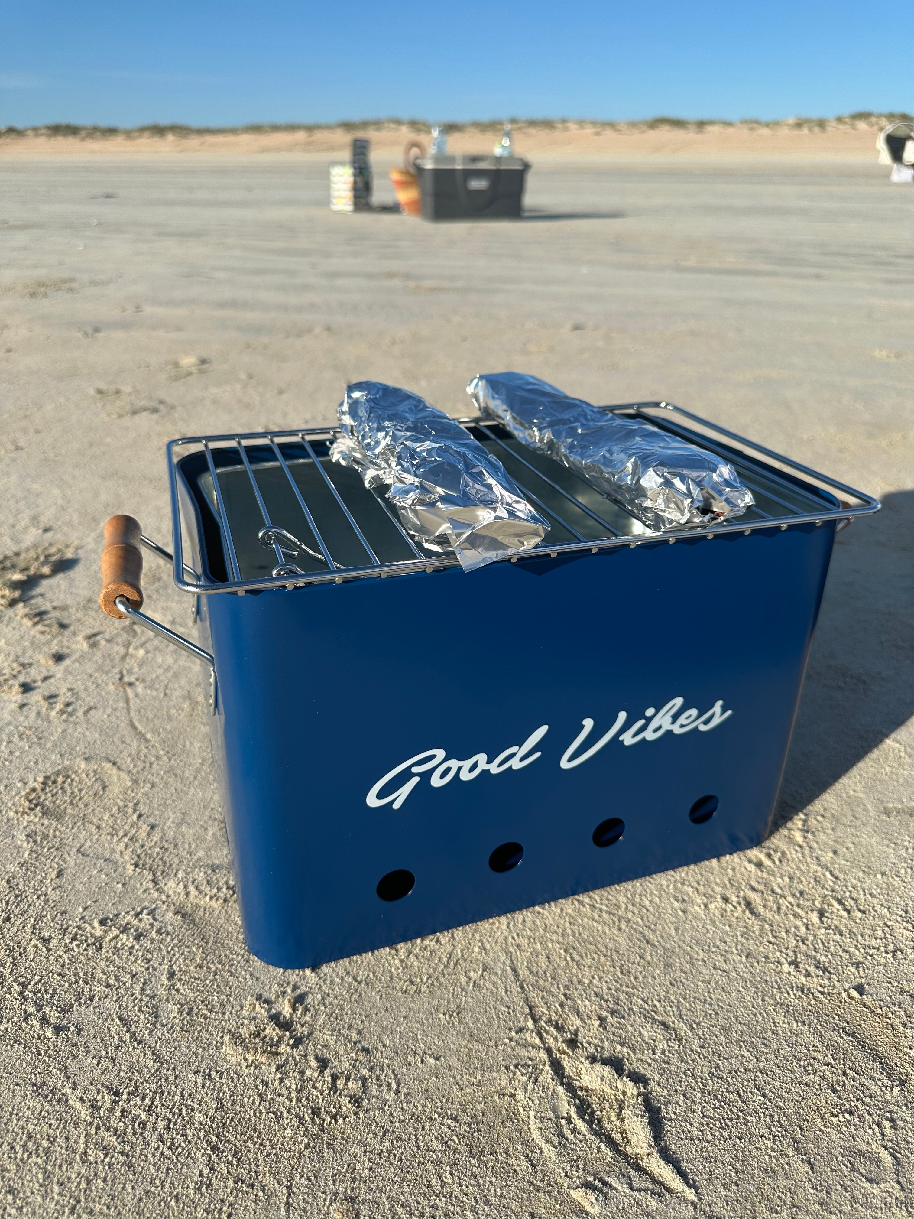 Introducing the Good Vibes Portable Charcoal BBQ - the perfect companion for beach outings, picnics, and camping...