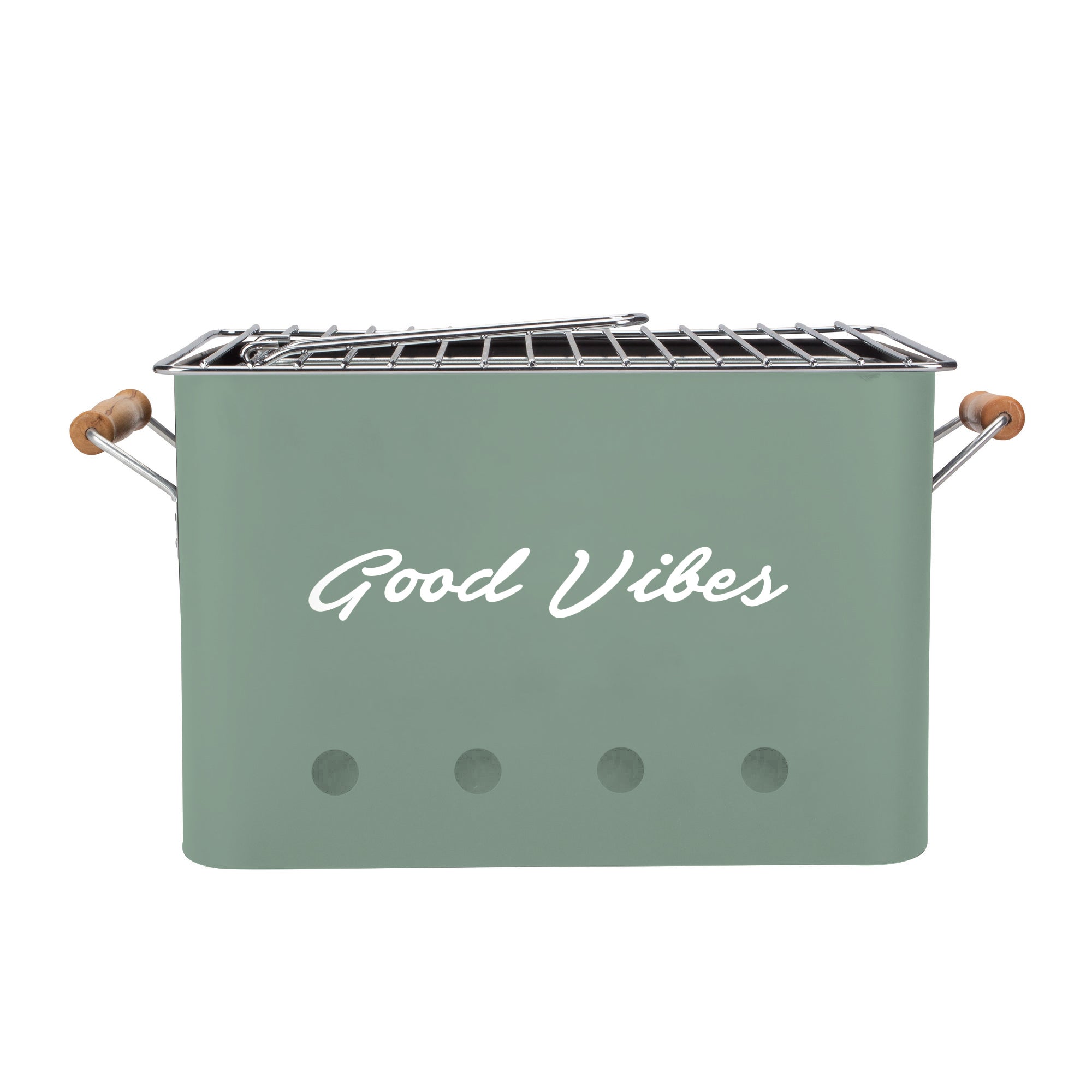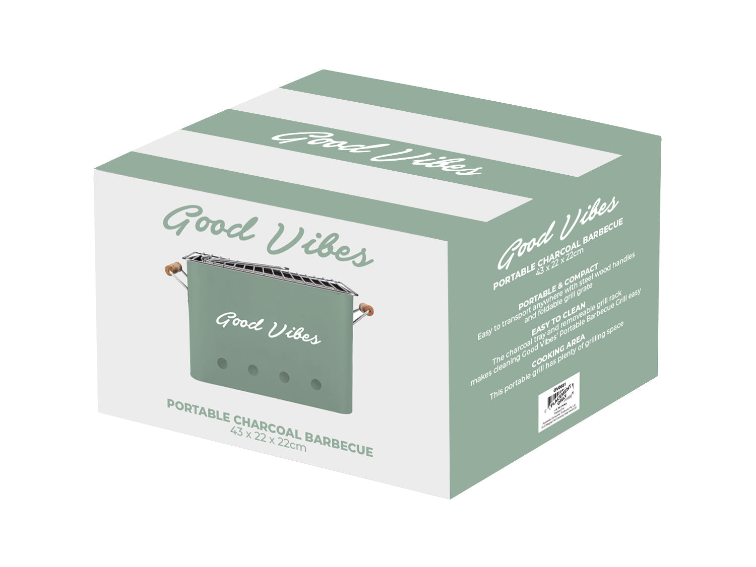 Introducing the Good Vibes Portable Charcoal BBQ - the perfect companion for beach outings, picnics, and camping adventures. With its wooden handles and compact design, this reusable BBQ is not only easy to carry but also adds a touch of rustic charm to your outdoor gatherings.