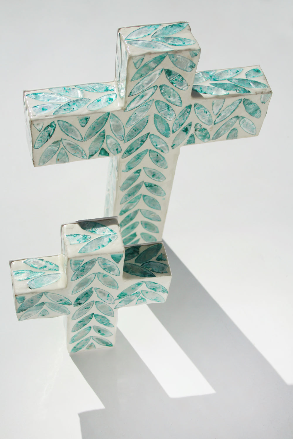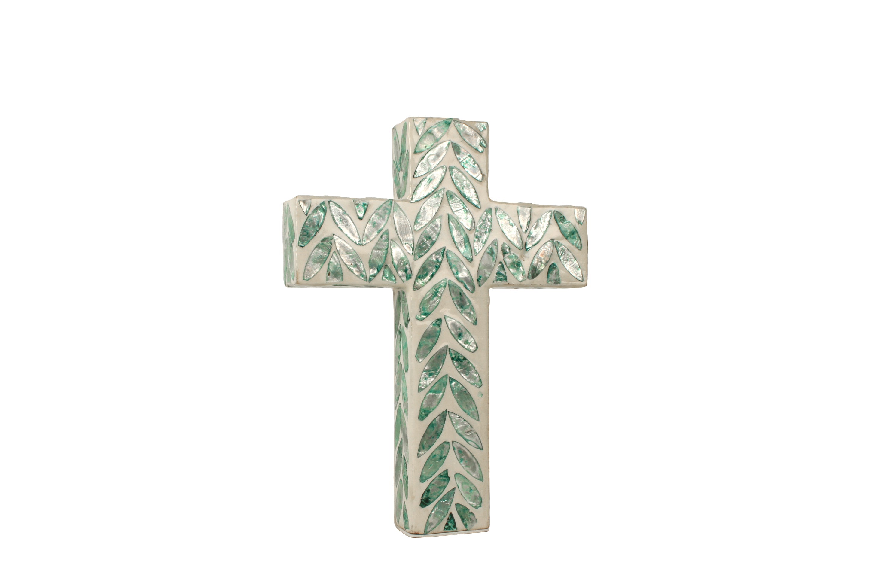 This beautifully crafted piece showcases a white porcelain cross embellished with lush green resin leaves, creating a harmonious blend of nature and spirituality. Hang it in your bedroom as a symbol of peace and tranquility or display it in your study for a gentle reminder of faith. The high-quality materials ensure durability while the intricate design adds an artistic flair to any room.