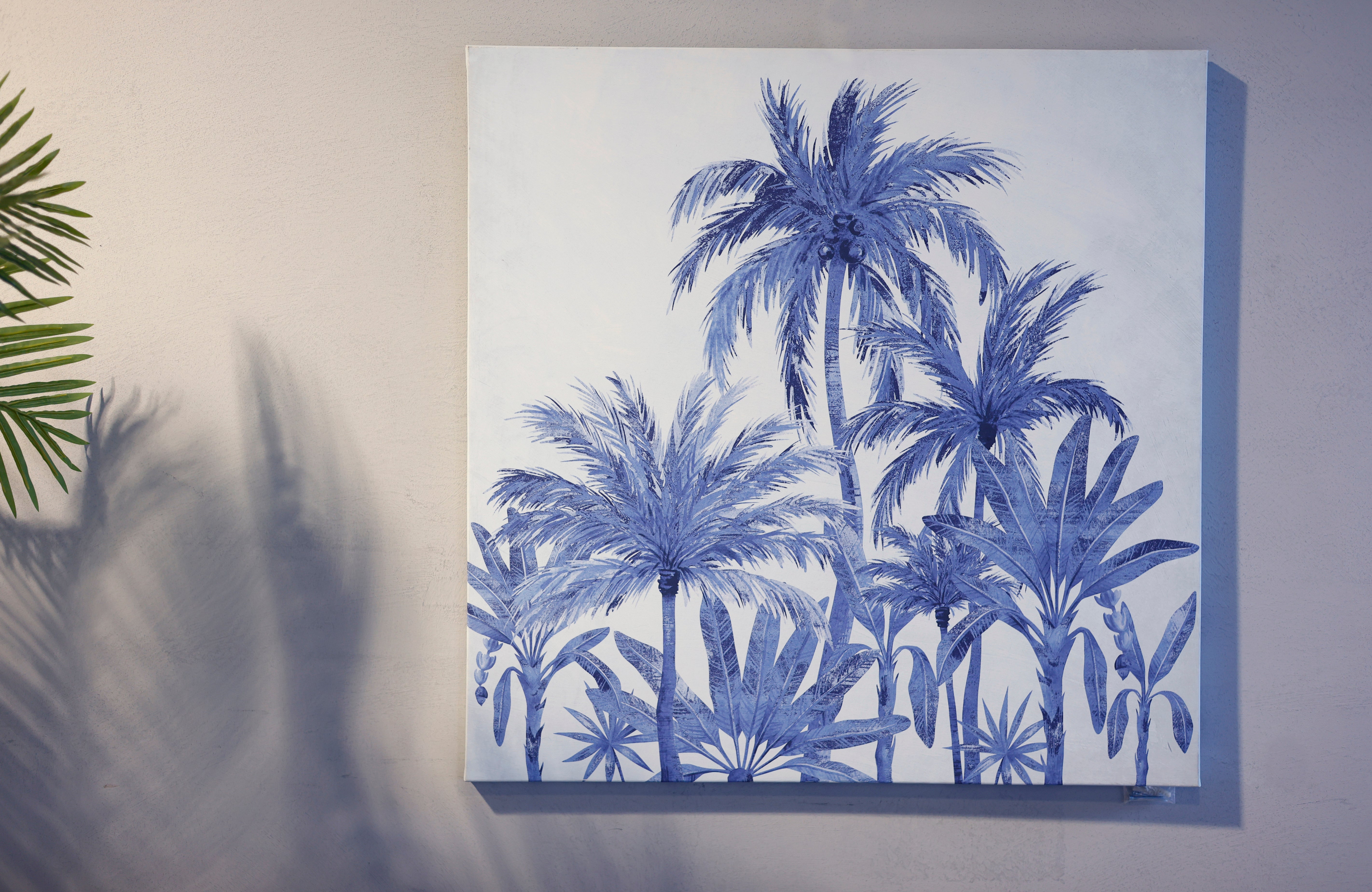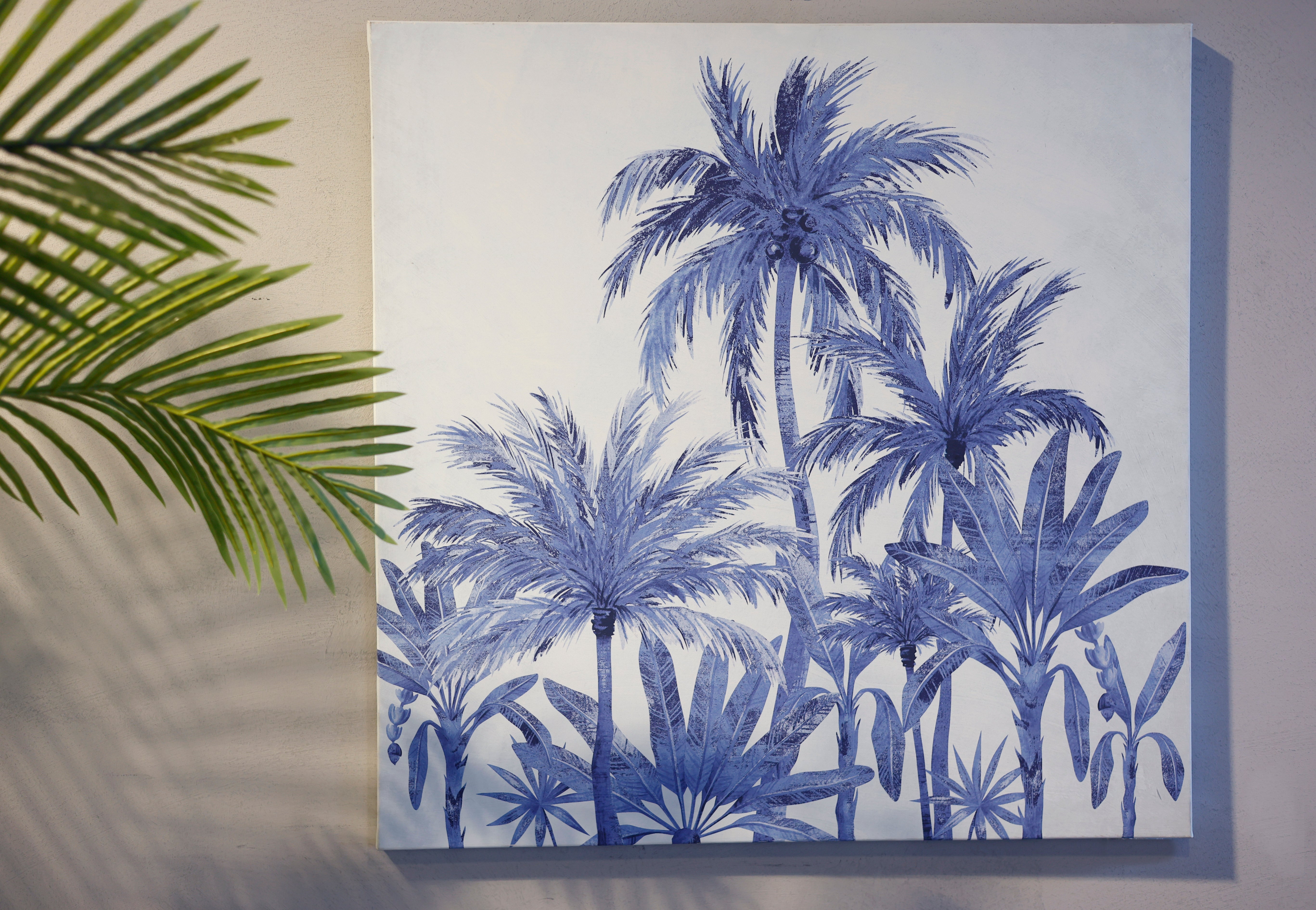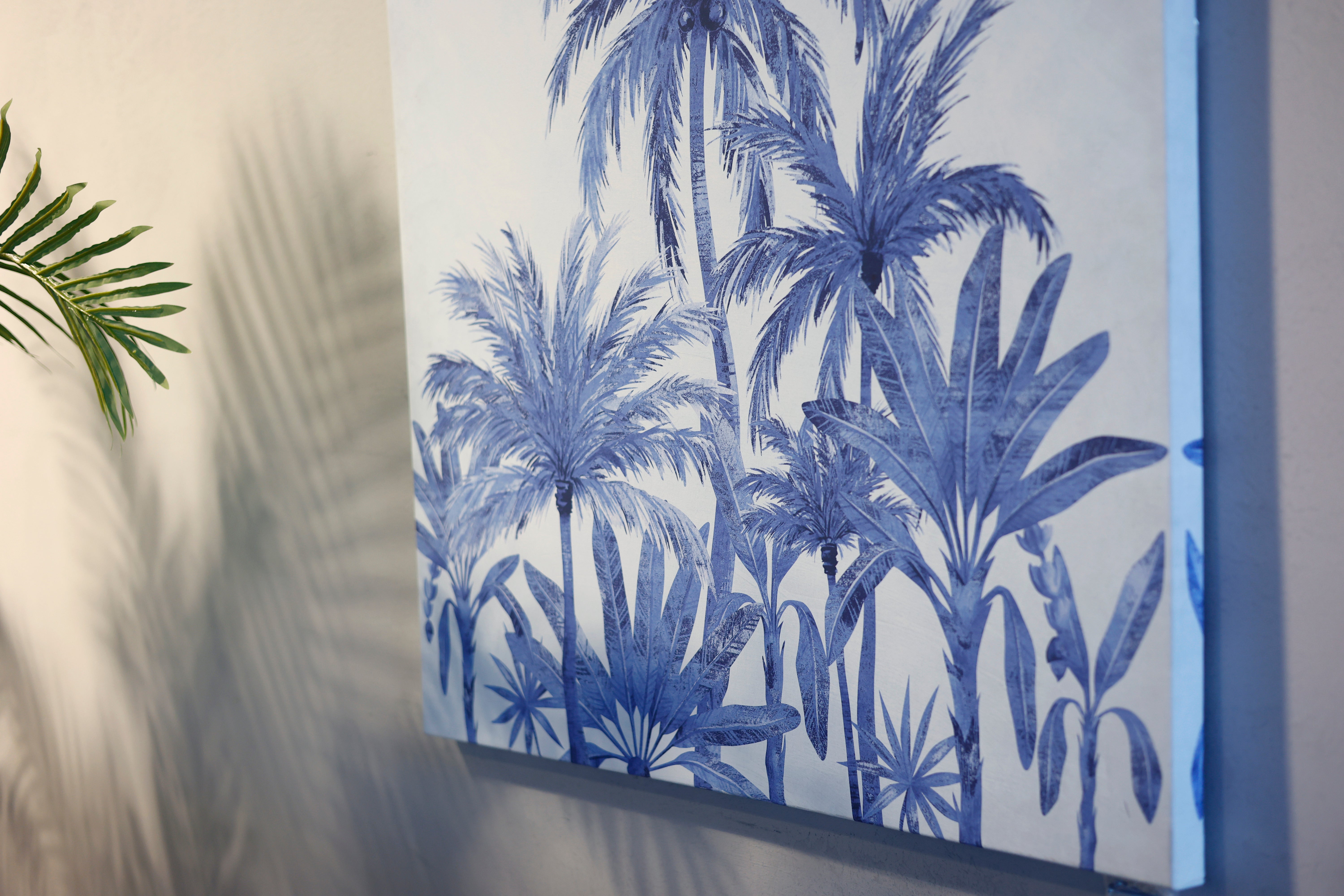 Transform your space into a tropical oasis with the Harvey Palm Paradise Print. This stunning stretched canvas print, framed in a sleek design, features mesmerizing palms in shades of blues and white. Bring the Hampton's style into your home with this 80 x 80cm masterpiece.