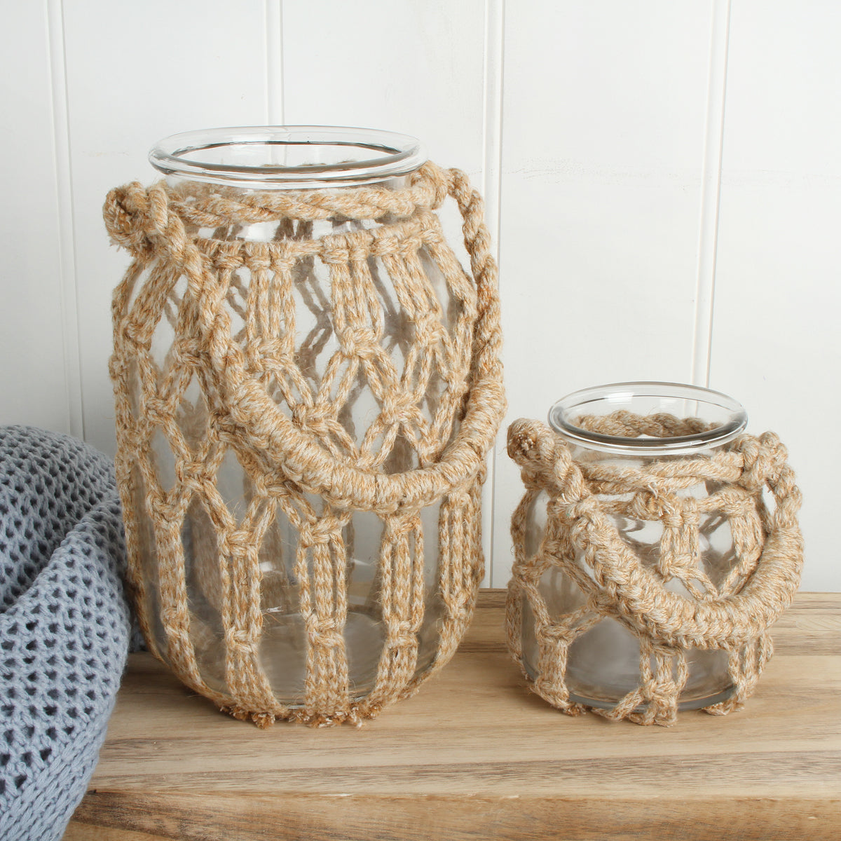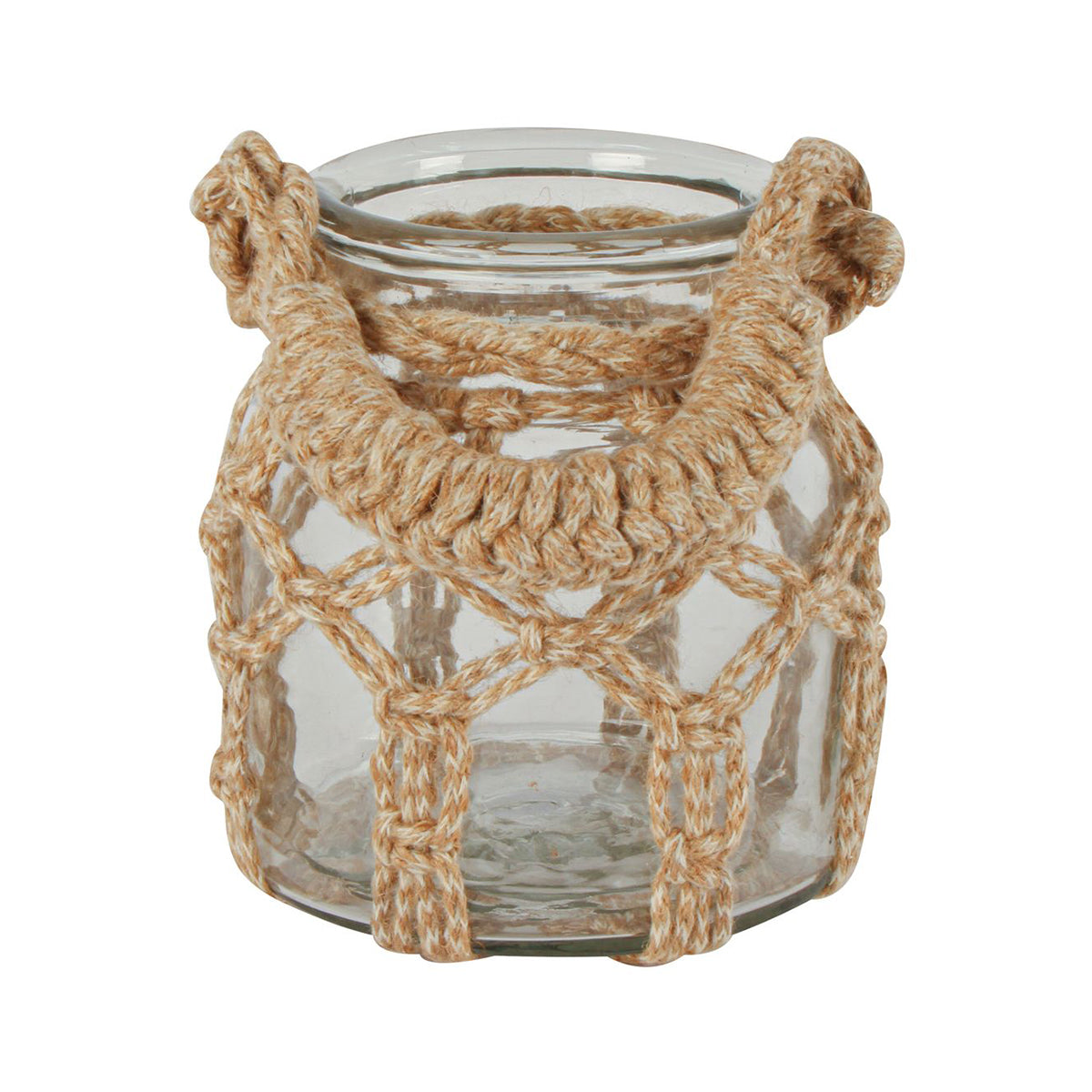 Cosy up any space with this lantern. Made with durable glass and designed with macrame that has natural look, this is a perfect decoration to add at your home. You can put your candles inside and let the brightness shine on your space. Also suited for battery operated candles. Create a perfect ambiance any time!